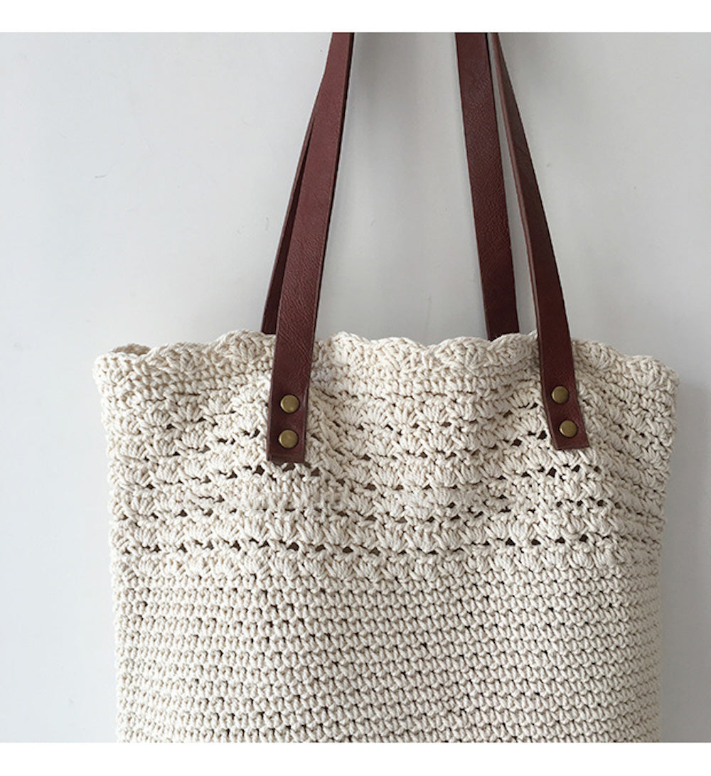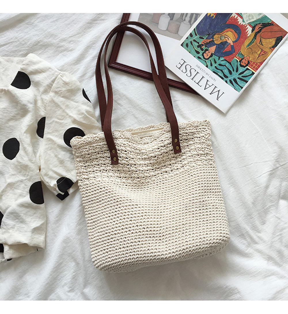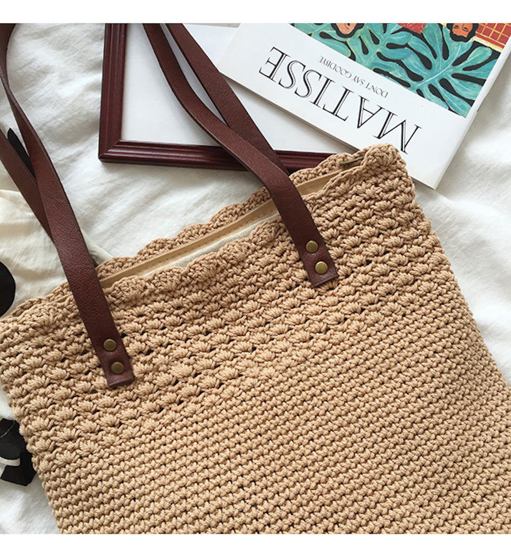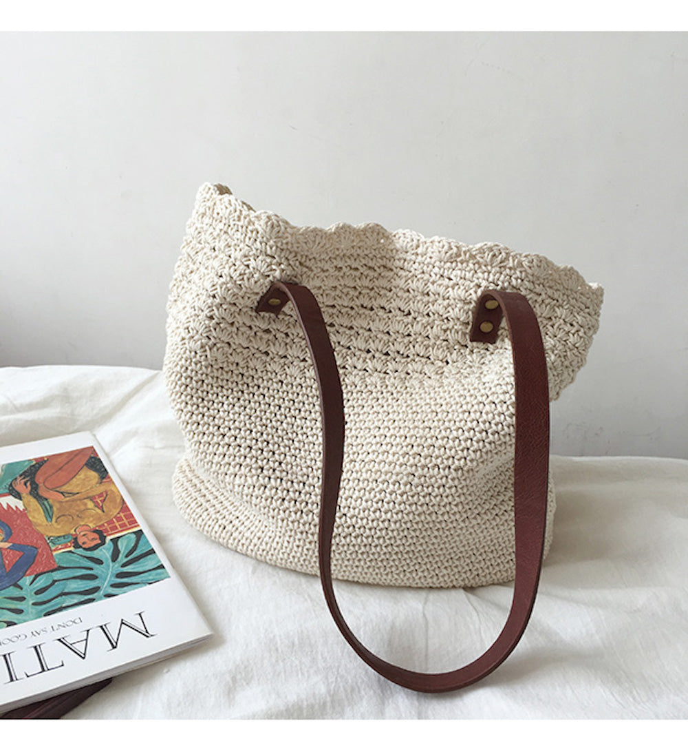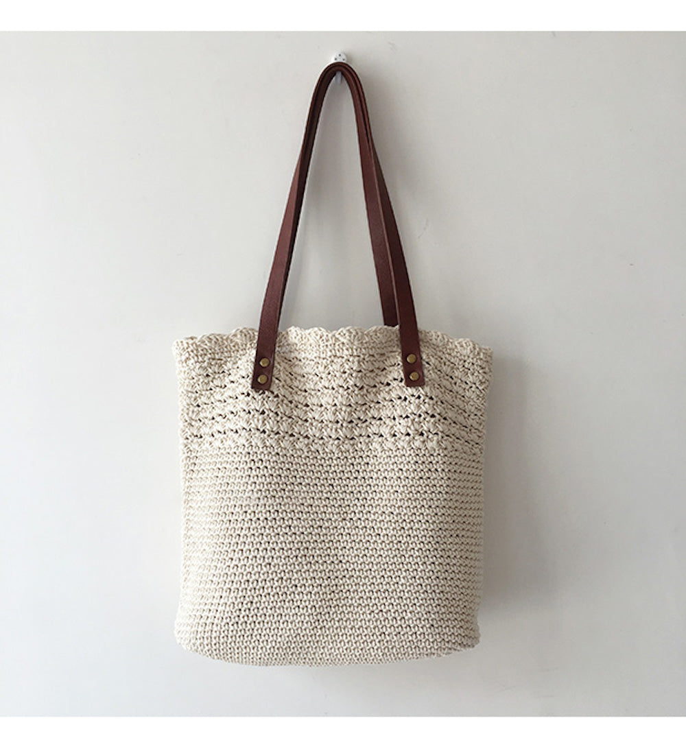 Handmade Crochet Shoulder Bag with Leather Strap, Hand Woven, Fashion Casual Bag, Gift for Her, Women's Woven Bag