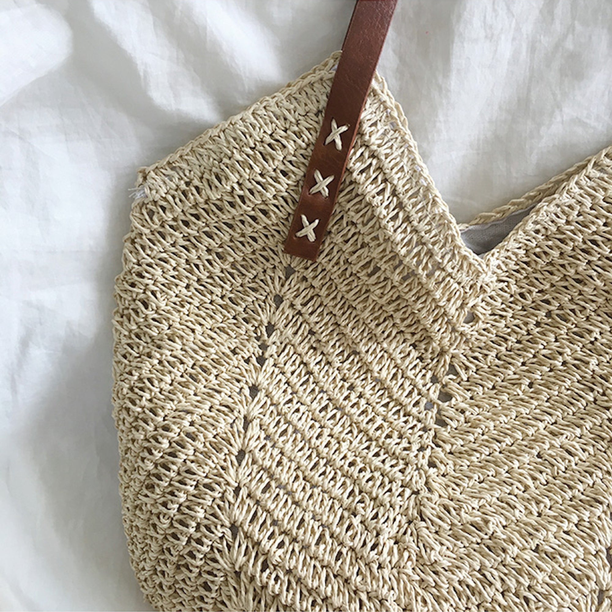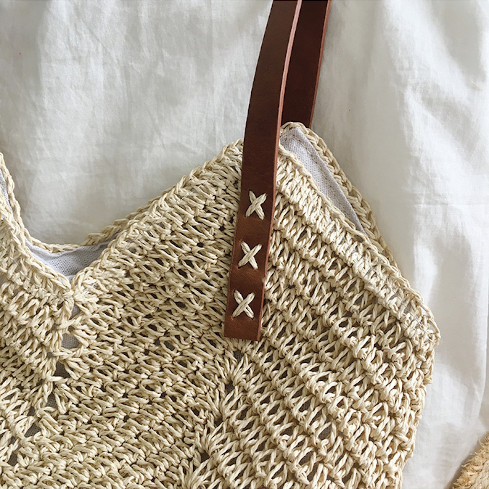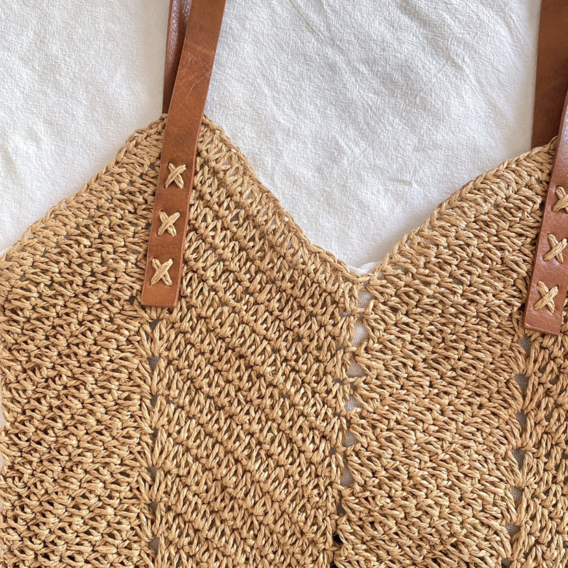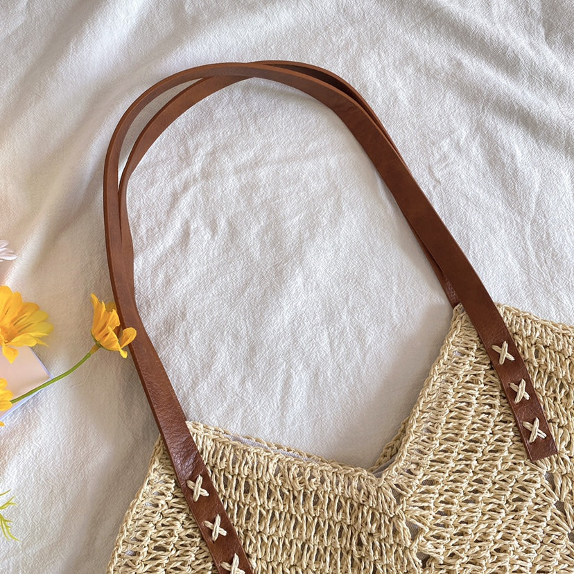 Retro Straw Woven Tote Bag with Leather Straps, Summer Beach Bag, Handmade Shoulder Bag, Boho Beach Bag