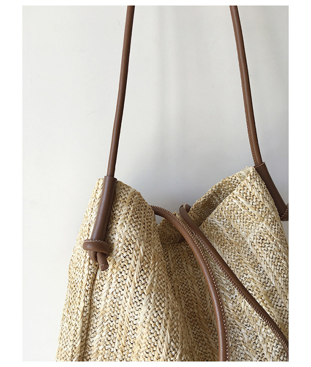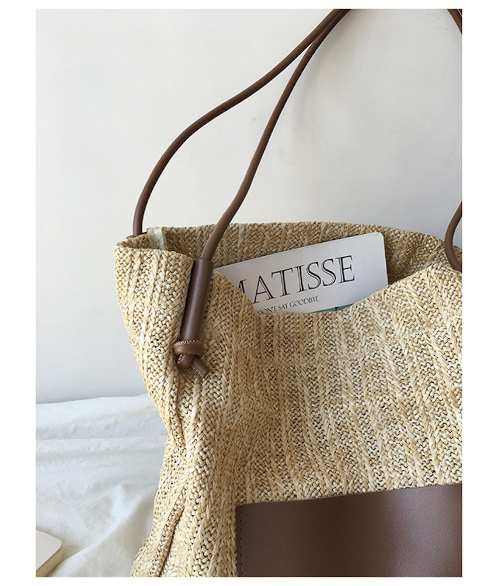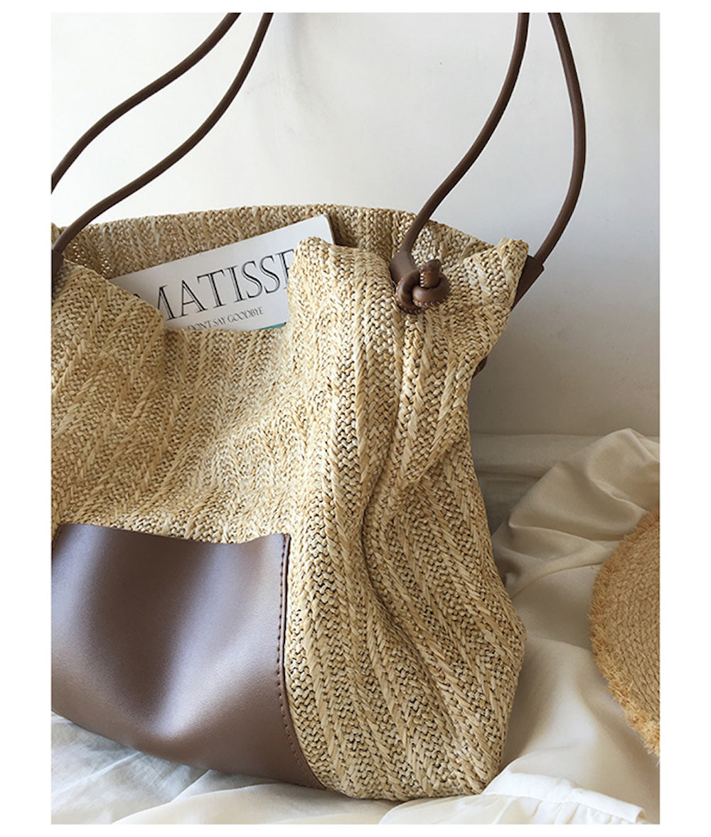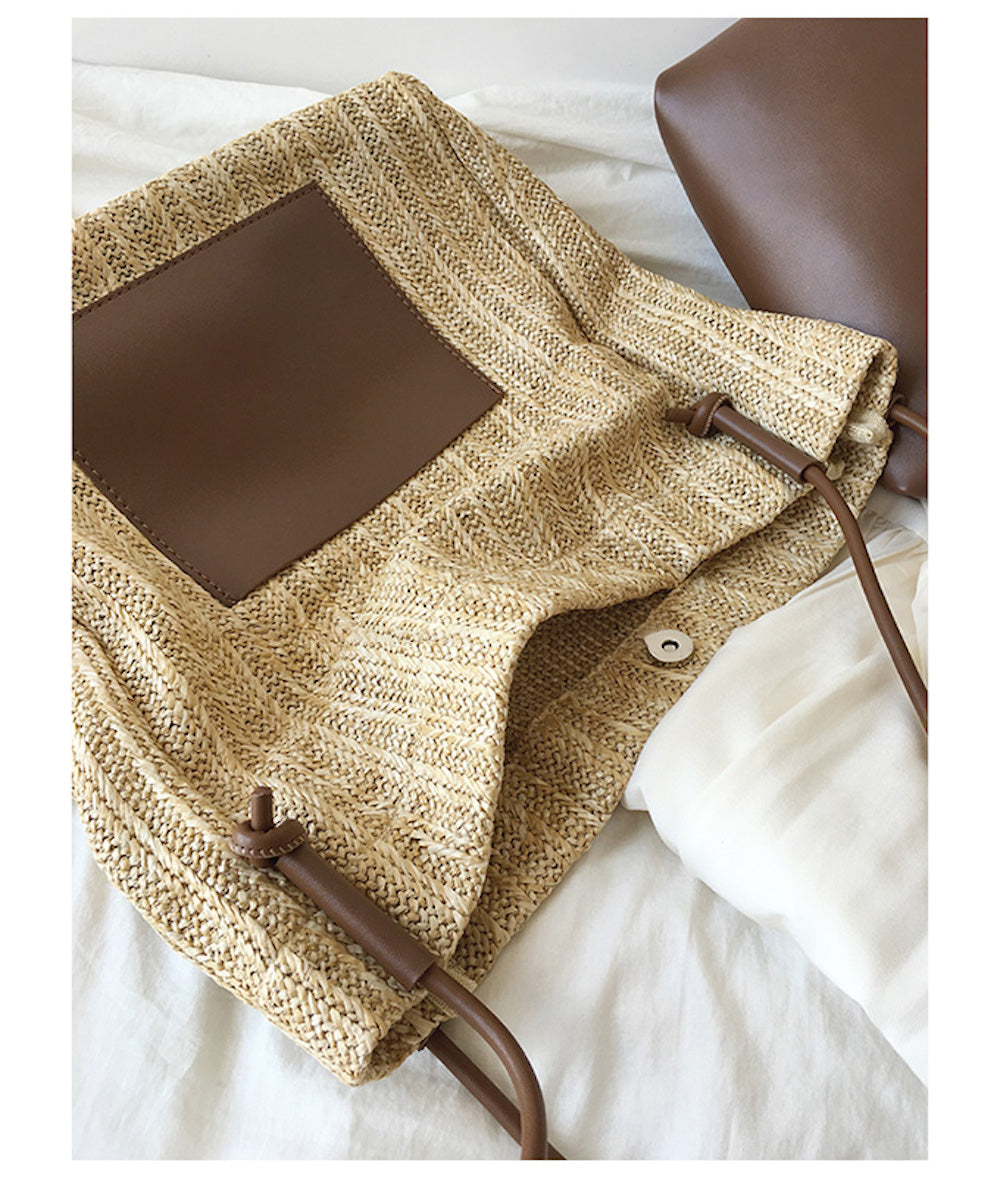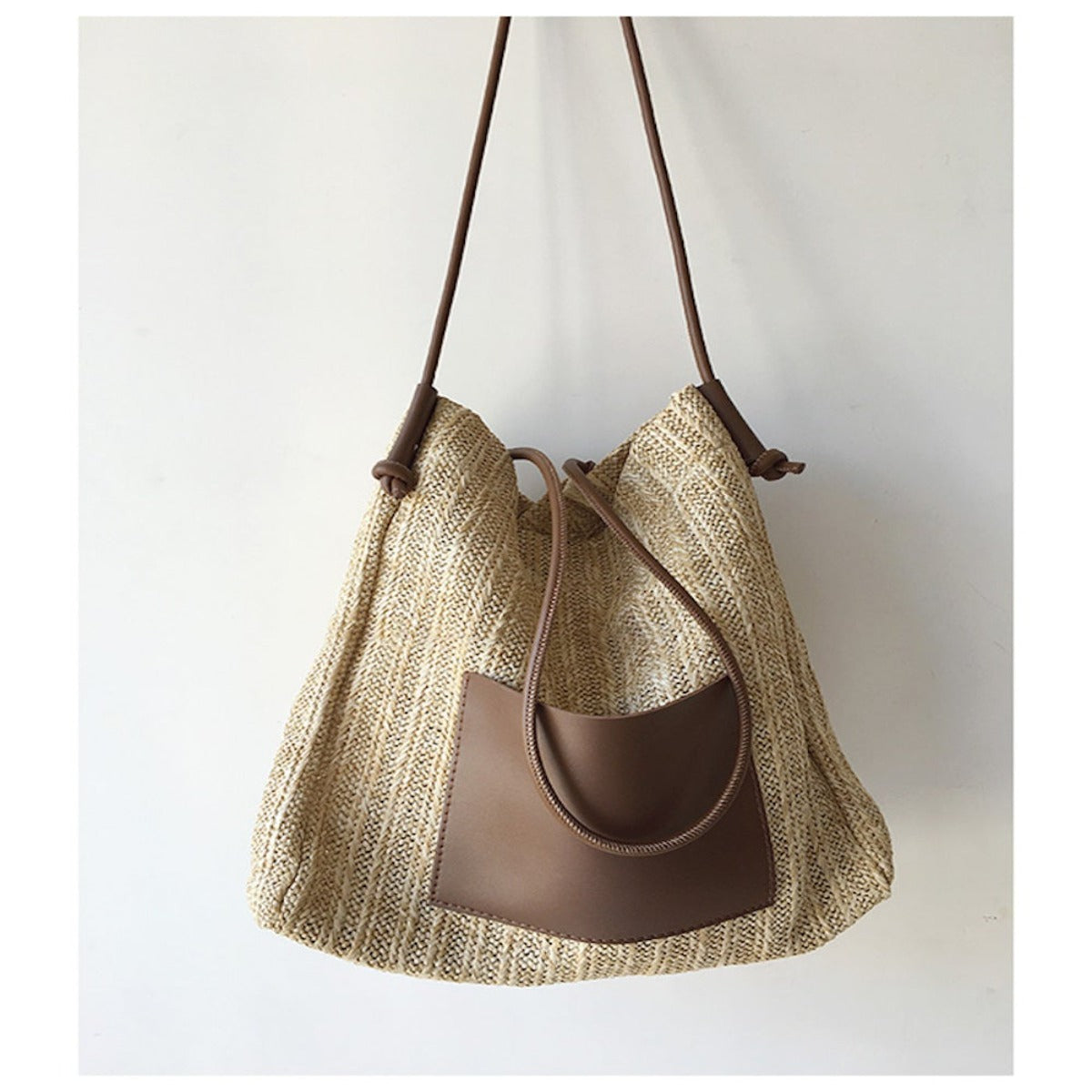 Straw Woven Tote Bag with Leather Accent, Retro Vibes, Summer Bag, Beach Shoulder Bag