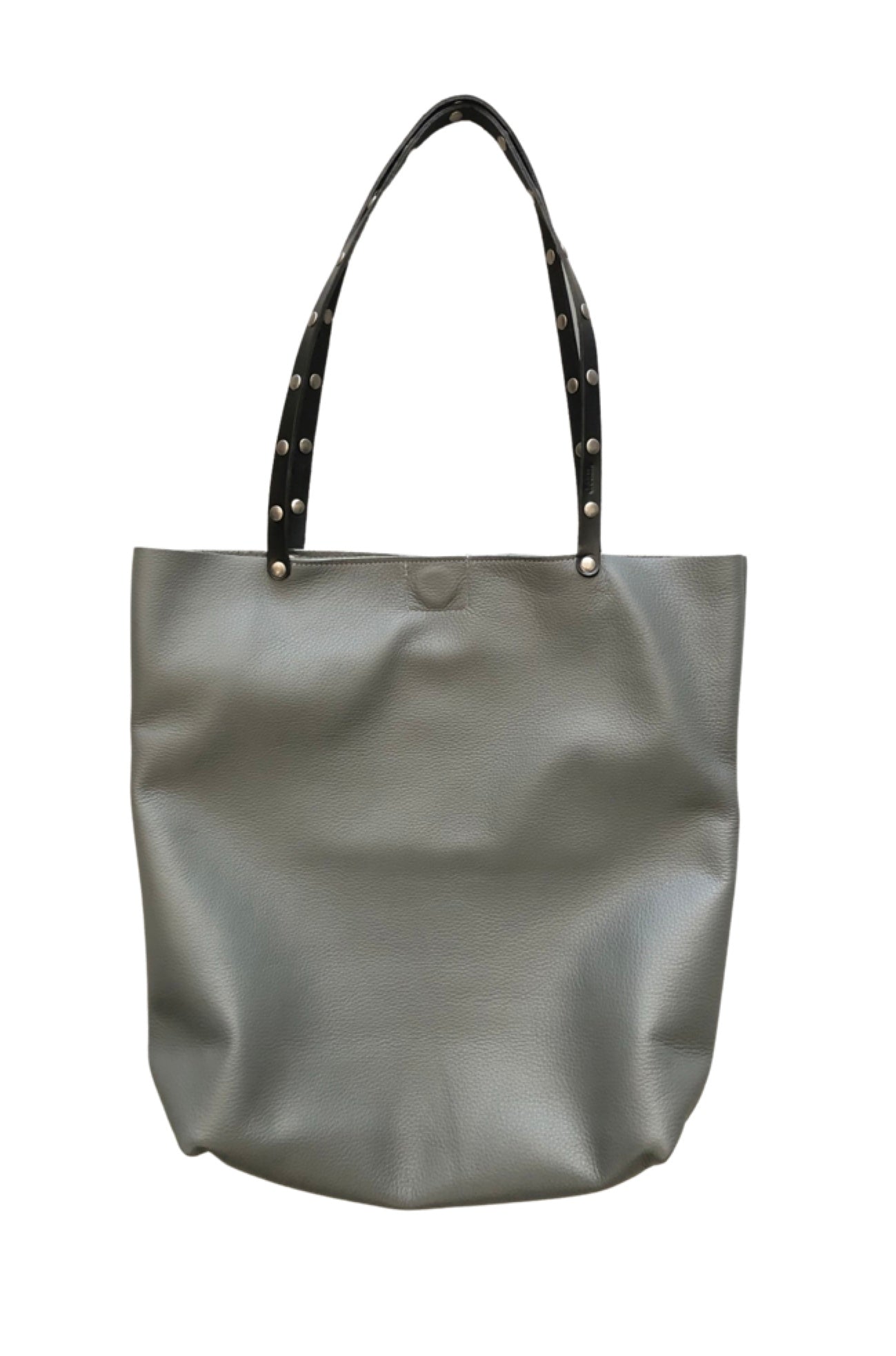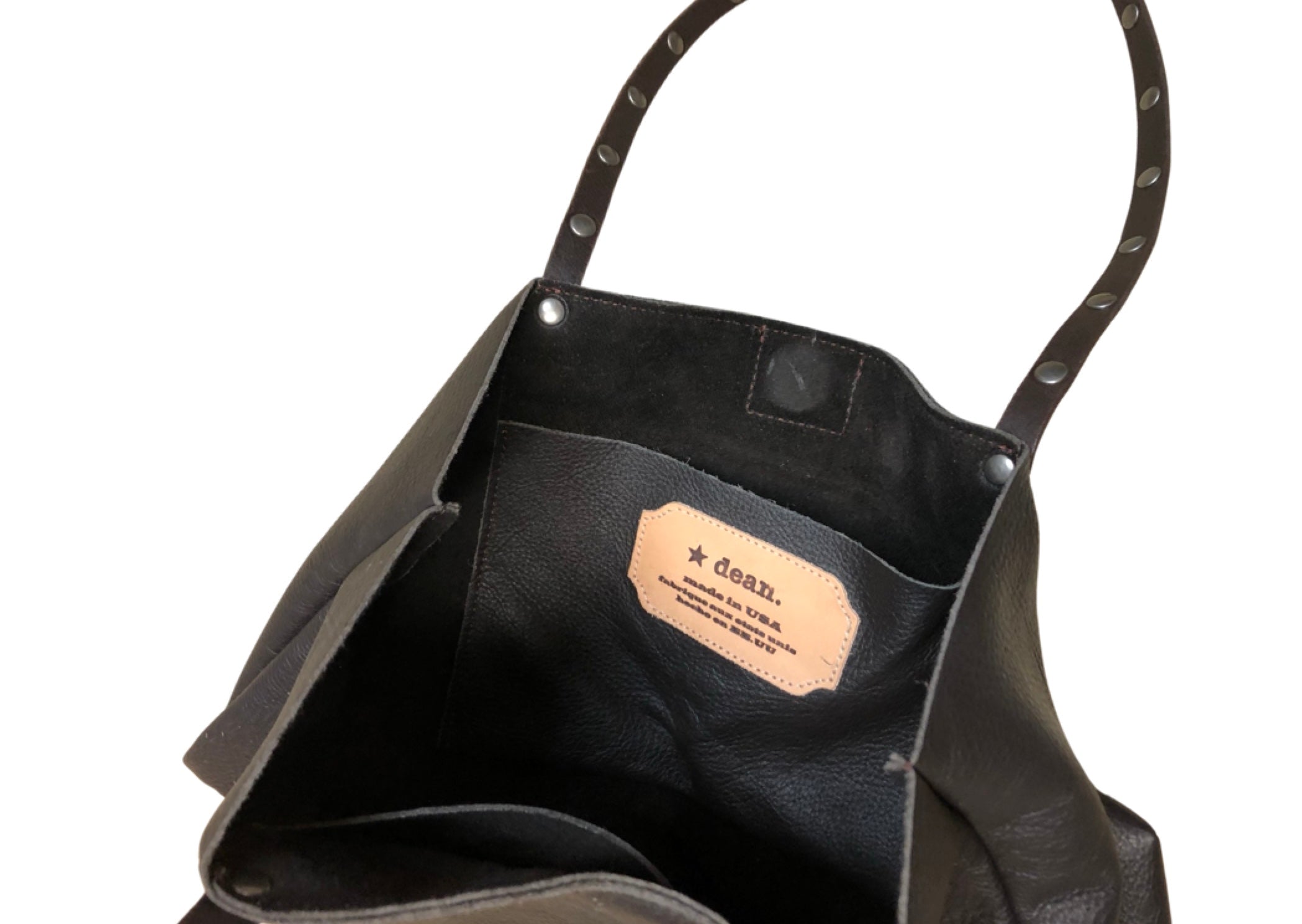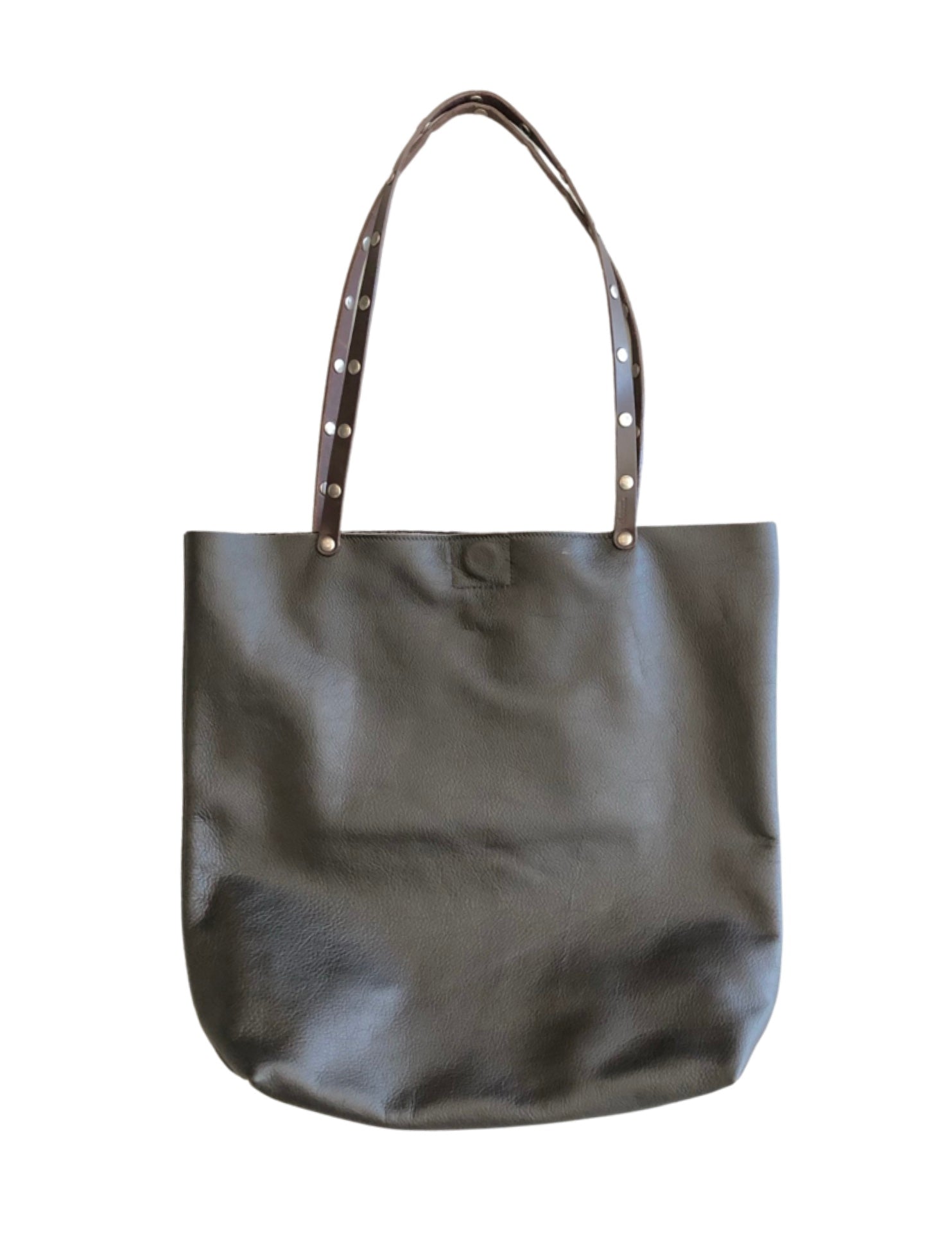 A mid size tote with latigo leather studded handles, two large interior pockets and a magnetic closure.