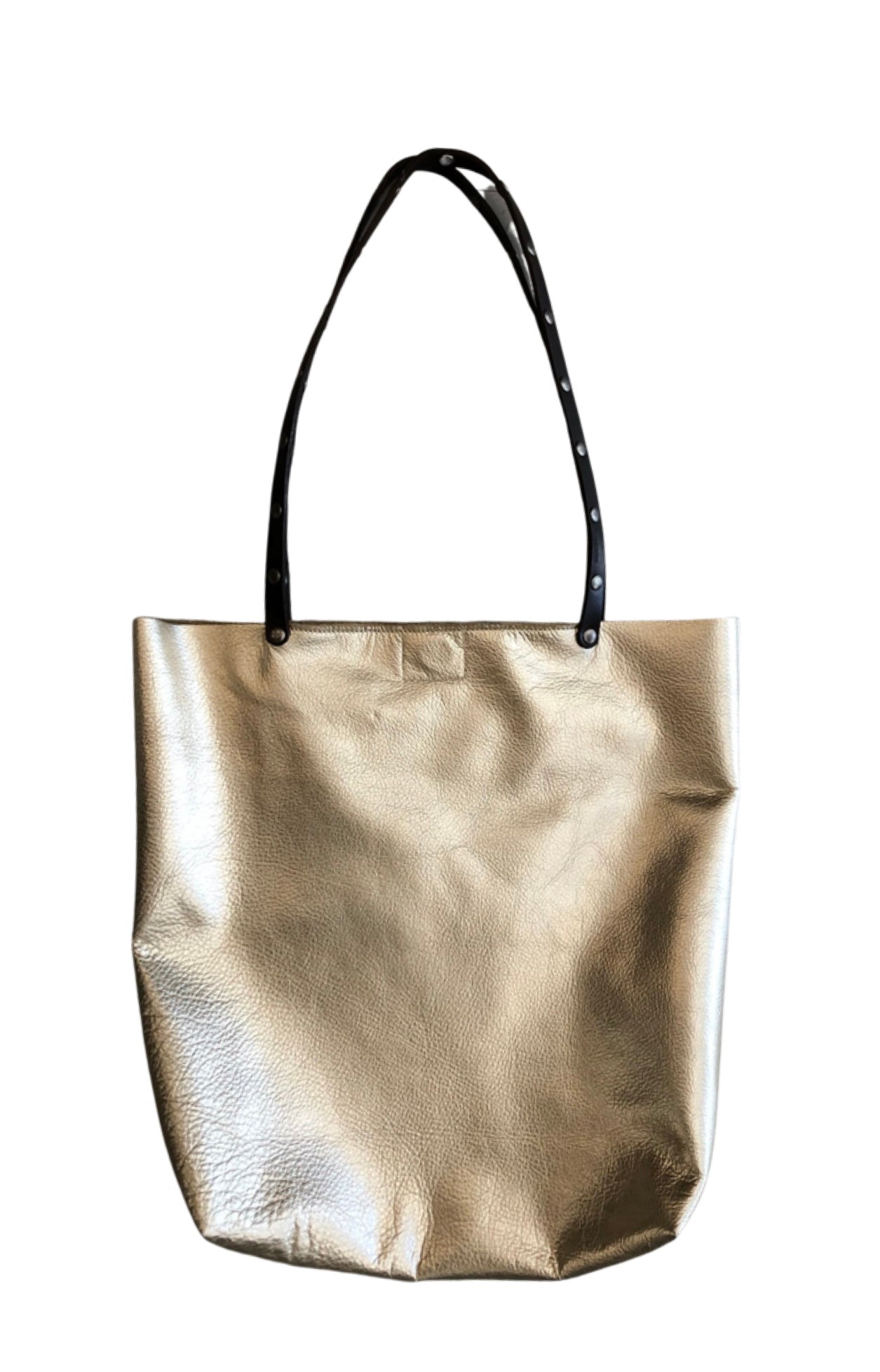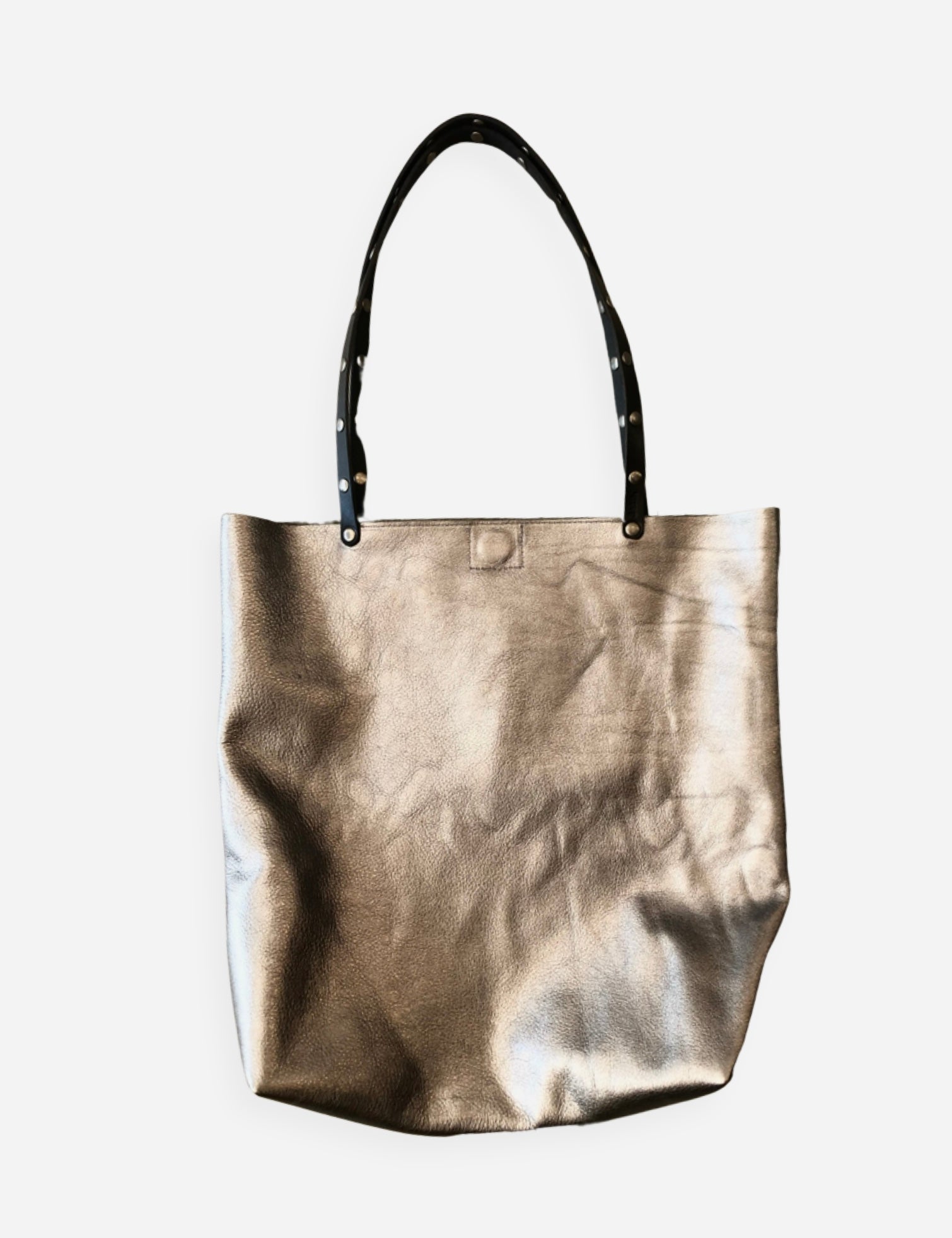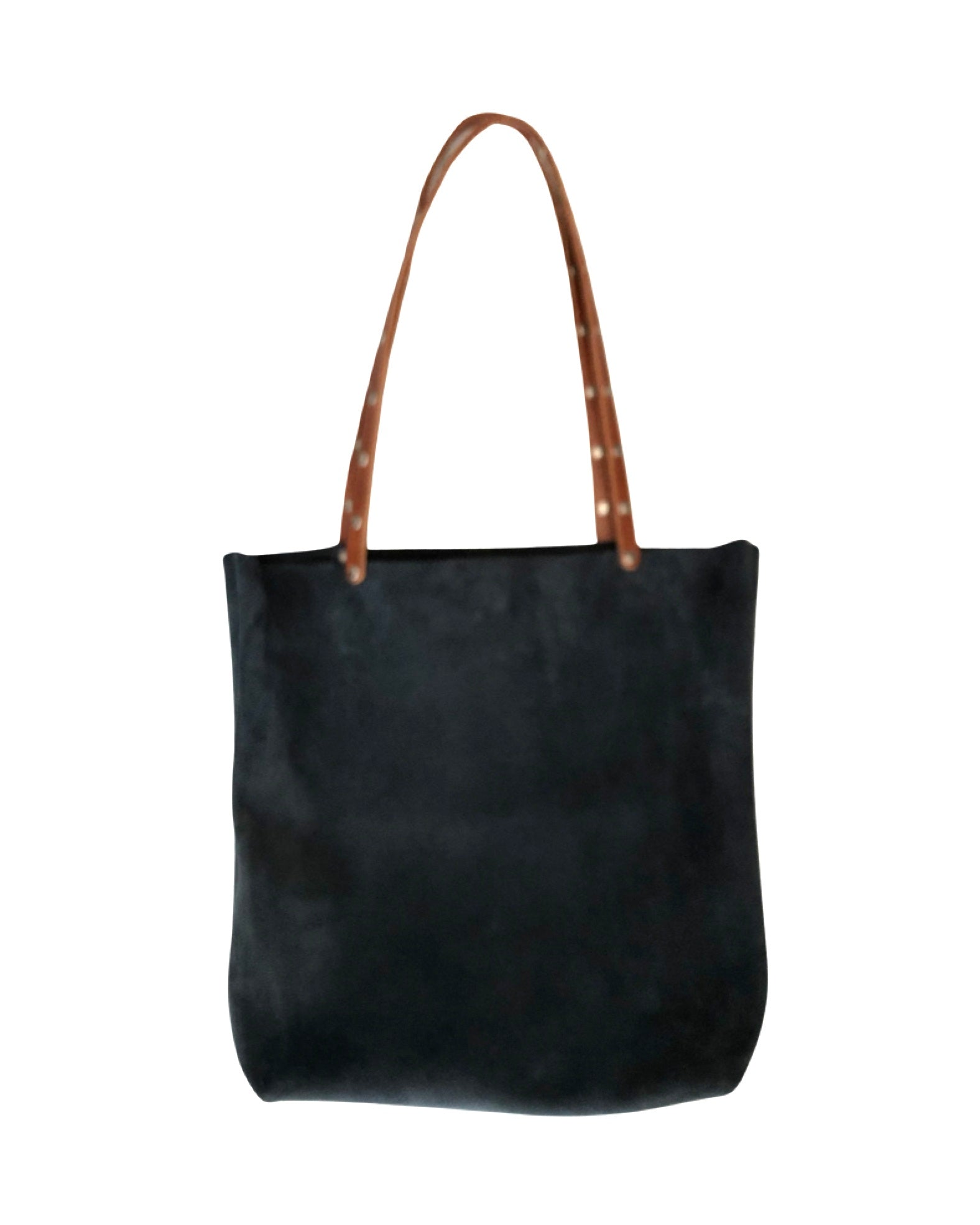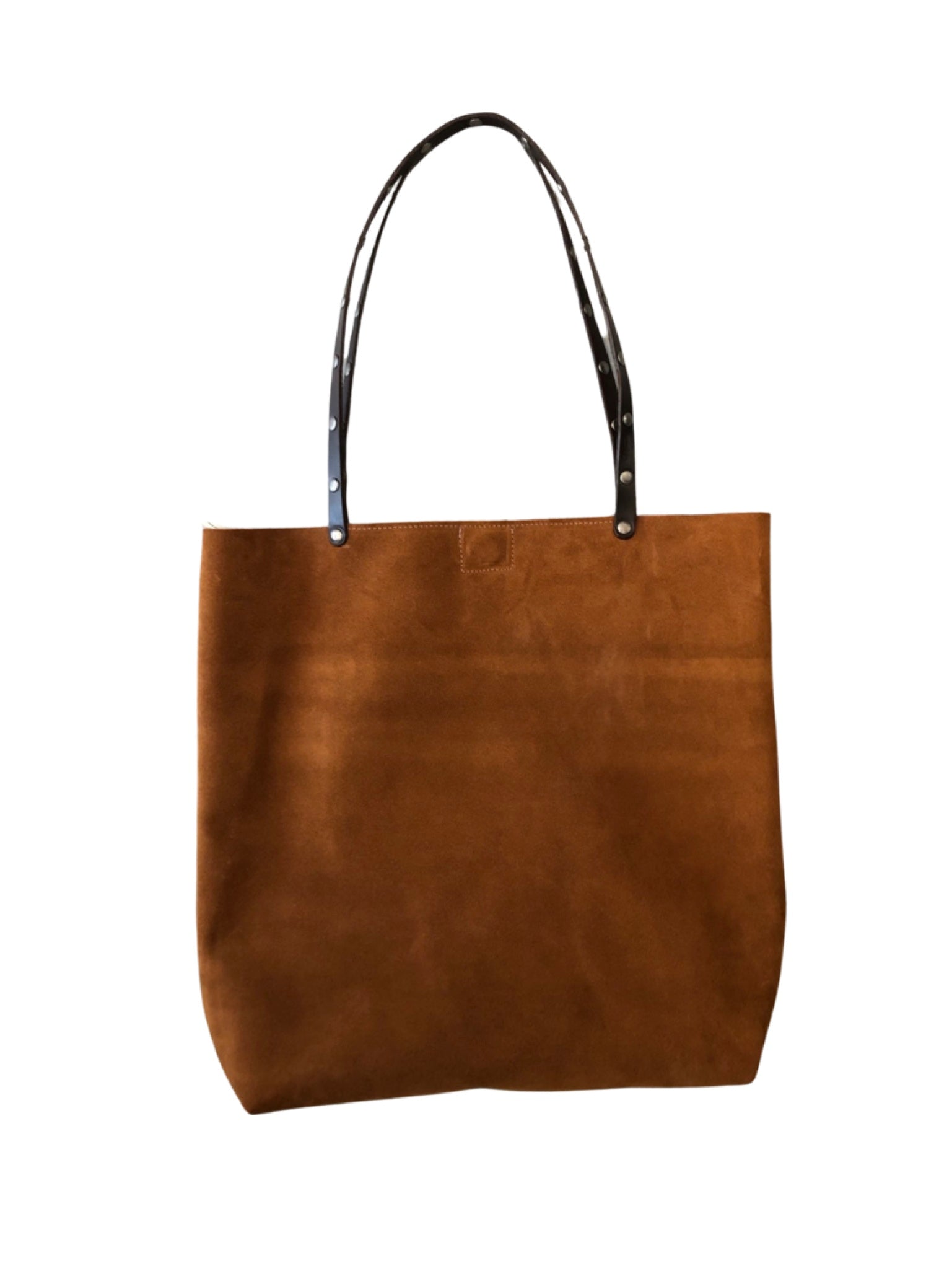 A mid size tote with latigo leather studded handles, two large interior pockets and a magnetic closure.